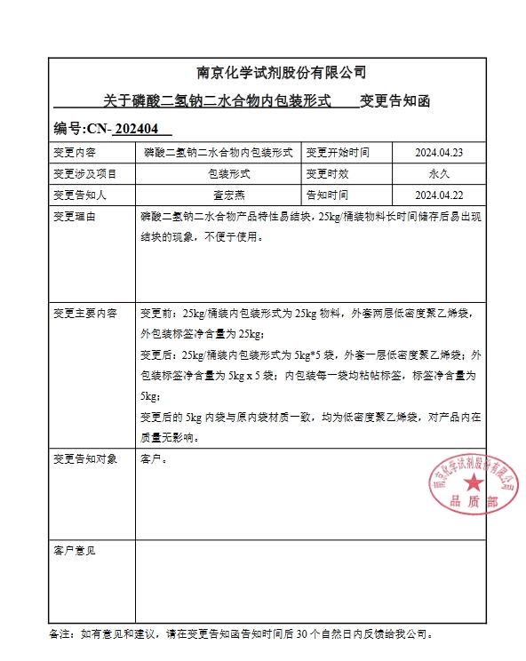 南京化學(xué)試劑股份有限公司:關(guān)于磷酸二氫鈉二水合物內(nèi)包裝形式變更告知函編號(hào):CN- 202404變更內(nèi)容:磷酸二氫鈉二水合物內(nèi)包裝形式變更開(kāi)始時(shí)間:2024.04.23變更時(shí)效:永久