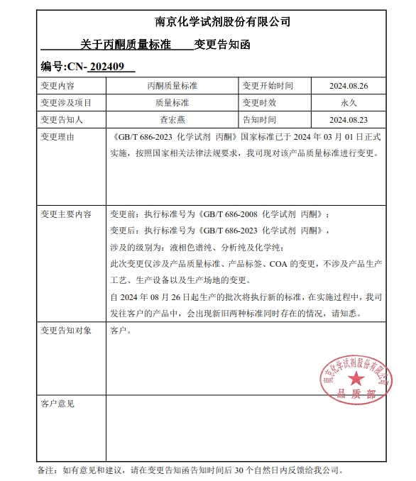 南京化學試劑股份有限公司將于2024.08.26對于丙酮質(zhì)量標準進行變更,具體如下:
