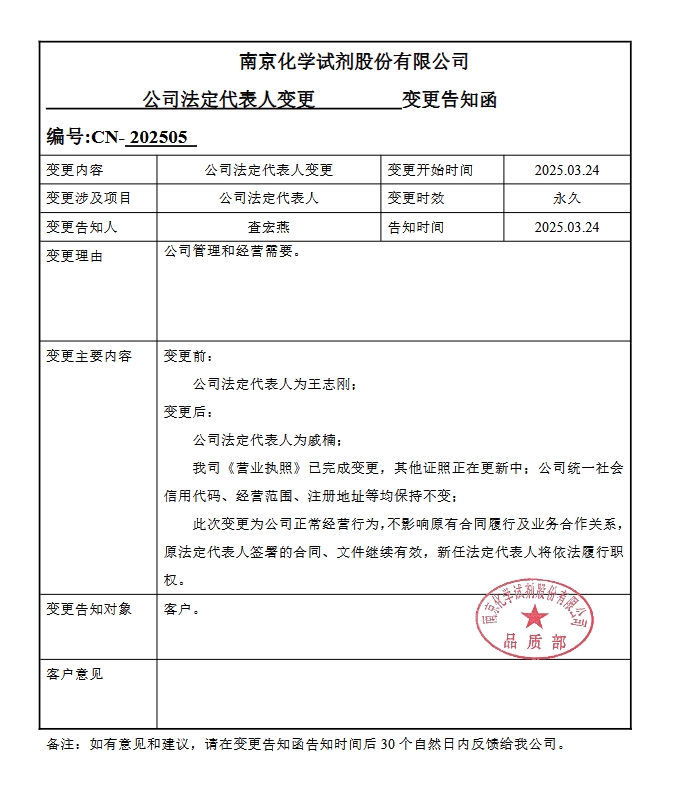 南京化學(xué)試劑股份有限公司法定代表人變更:由王志剛變更為戚楠,變更日期2025.03.24,詳情如下: