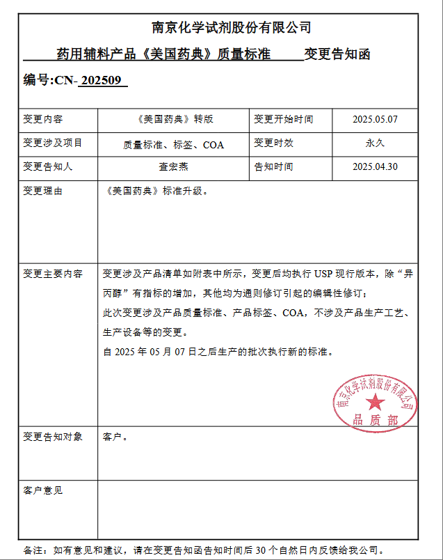 藥用輔料產(chǎn)品《美國藥典》質(zhì)量標(biāo)準(zhǔn)變更告知函