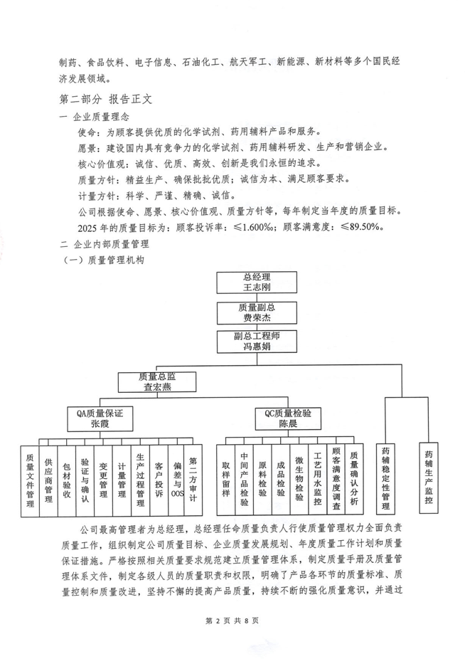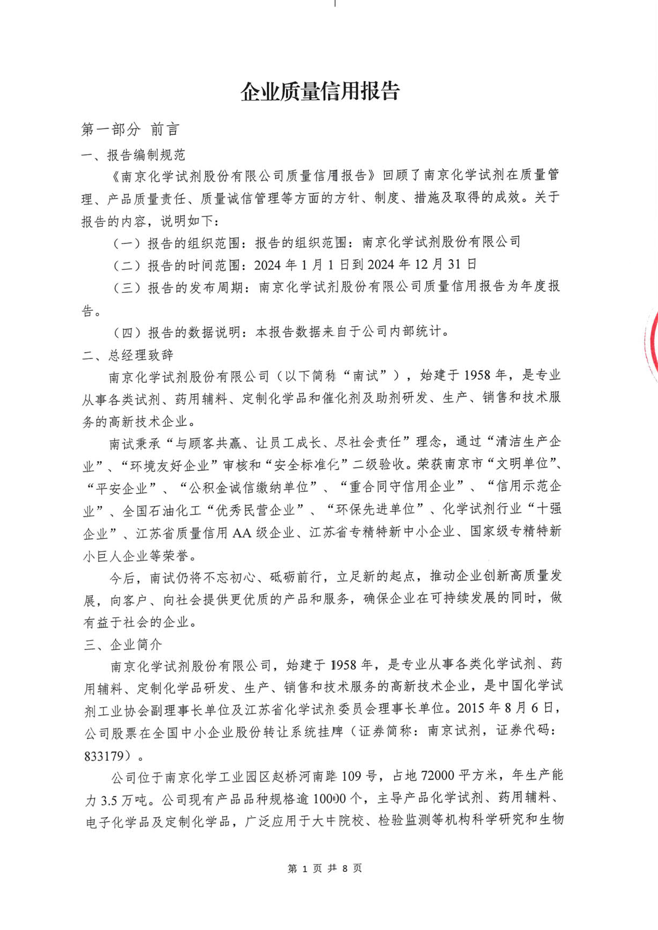 《南京化學試劑股份有限公司質量信用報告》回顧了南京化學試劑在質量管理、產品質量責任、質量誠信管理等方面的方針、制度、措施及取得的成效。關于報告的內容,說明如下: